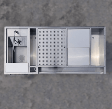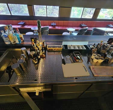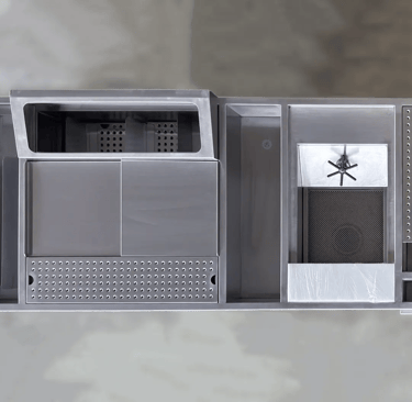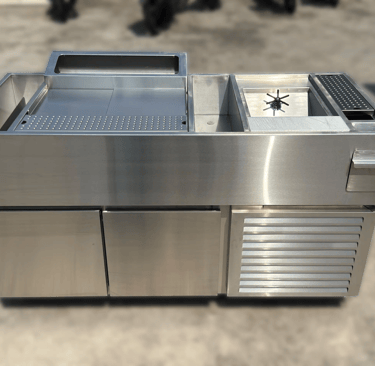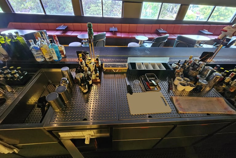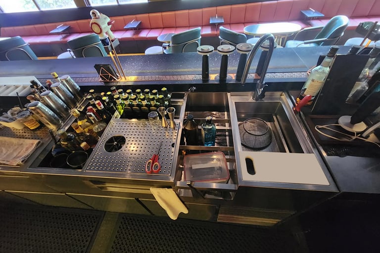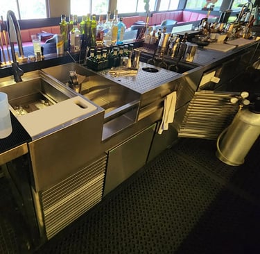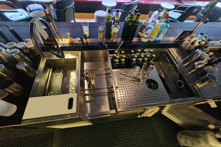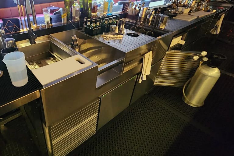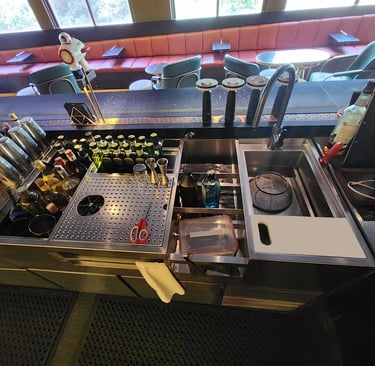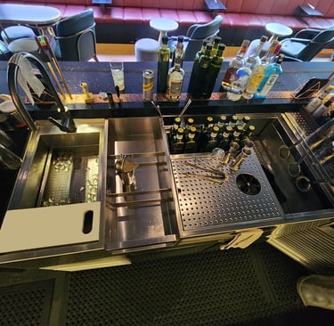 A bartender’s favorite — fully customizable stainless steel station designed for smooth workflow, with integrated ice bin, sink, and bottle storage.